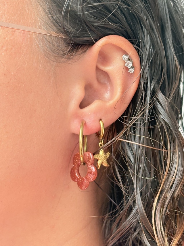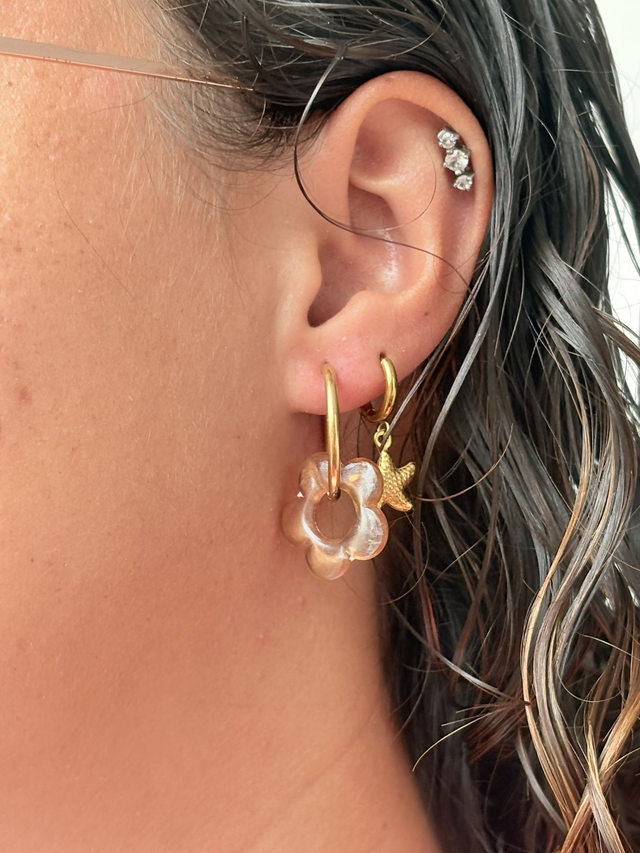 Ces boucles d'oreilles se composent de créoles en acier inoxydable dorées, ornées d'un pendentif en forme de fleur.