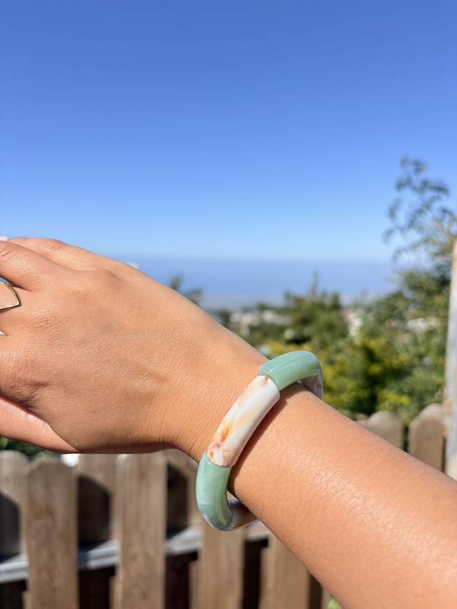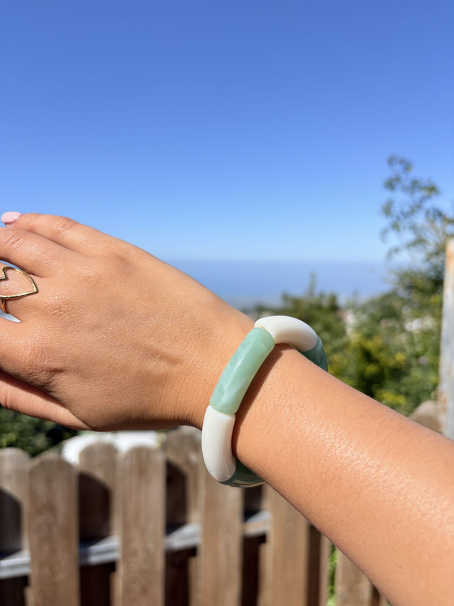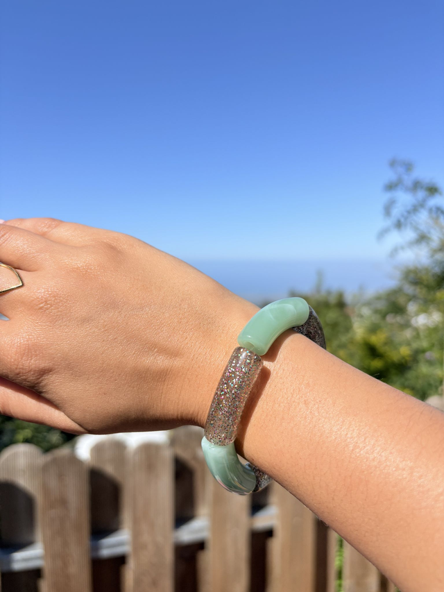 Bracelet fantaisie en acrylique, monté sur un fil élastique résistant.