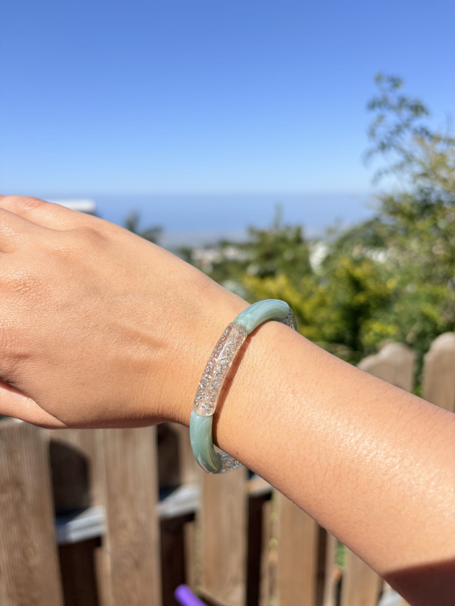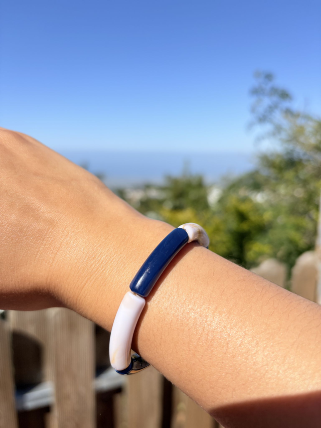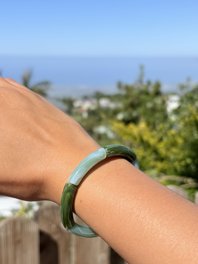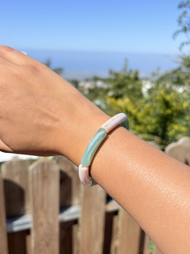 Bracelet fantaisie en acrylique, monté sur un fil élastique résistant.