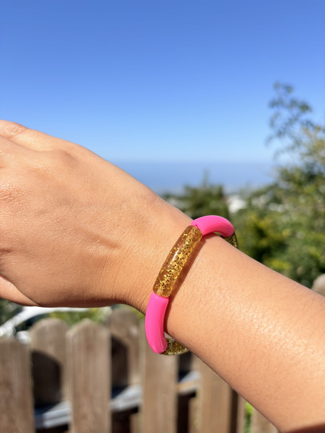 Bracelet fantaisie en acrylique, monté sur un fil élastique résistant.