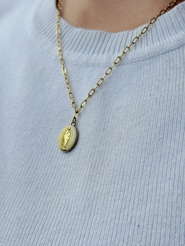 Un collier raffiné orné d'une médaille dorée, symbole de foi et de protection.