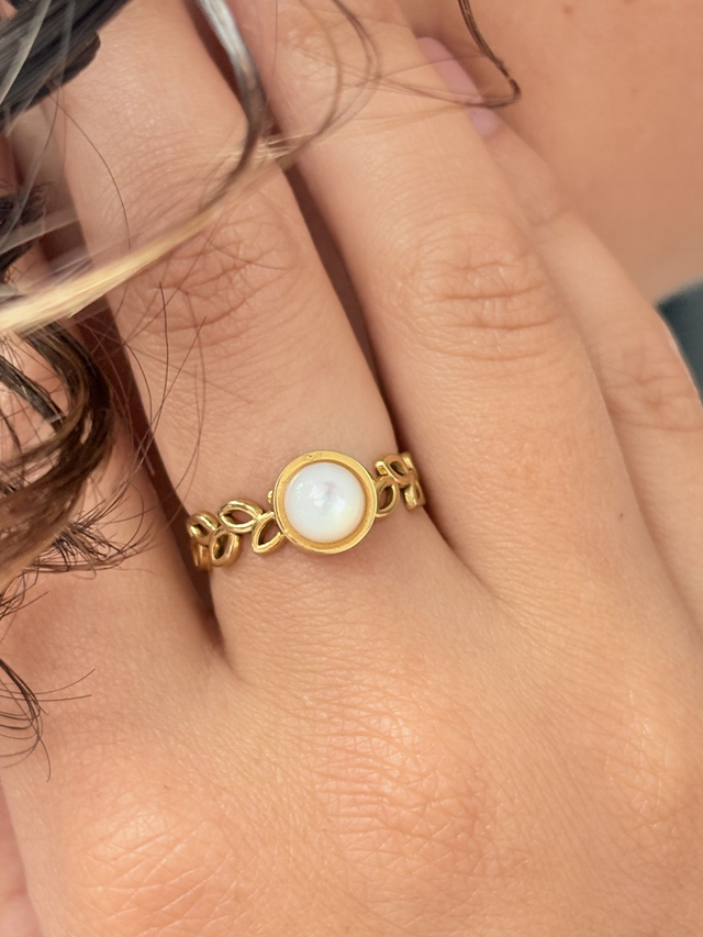 Bague dorée, avec une pierre blanche et motif feuillage.
